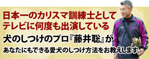 50年以上、犬と共に暮らし、1000頭以上の犬を手掛けてきた日本一のカリスマ訓練士としてテレビ番組に何度も出演しているプロドッグトレーナーの藤井聡が、愛犬のしつけに大切なことをわかり易くご説明いたします。